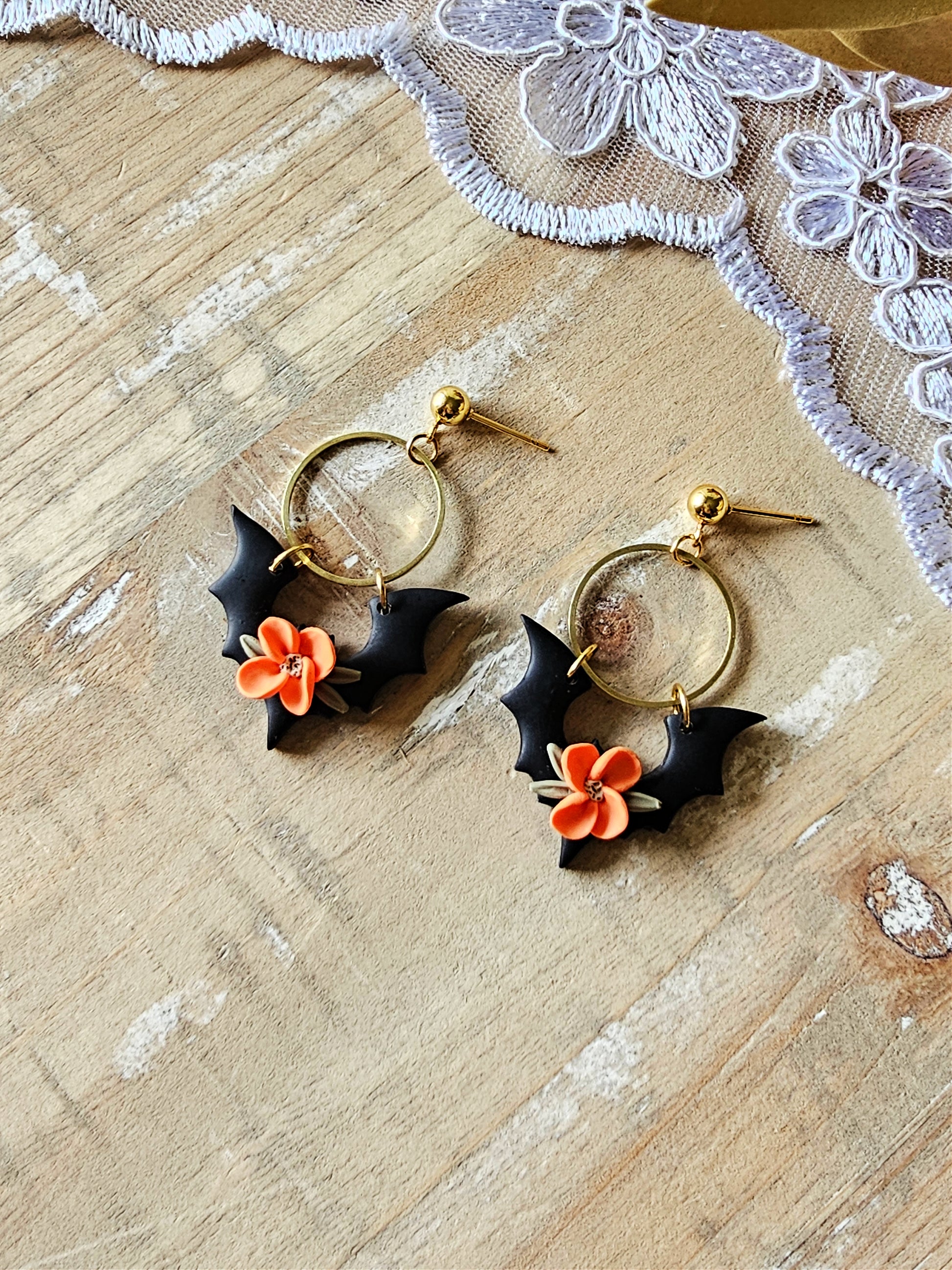 Floral Bat Clay Earrings | Bat Earrings | Halloween Earrings | Halloween Jewelry | Polymer Clay Earrings