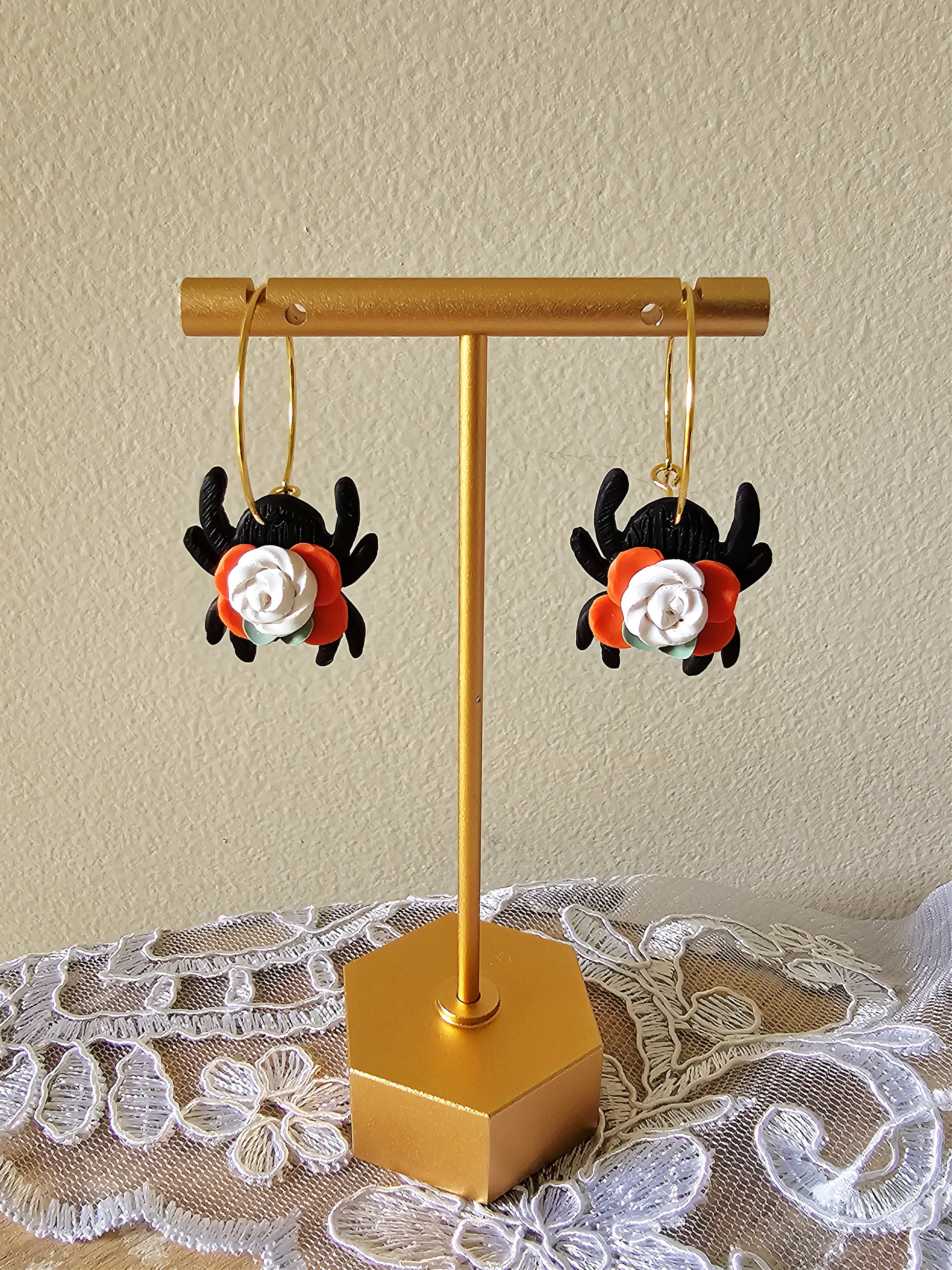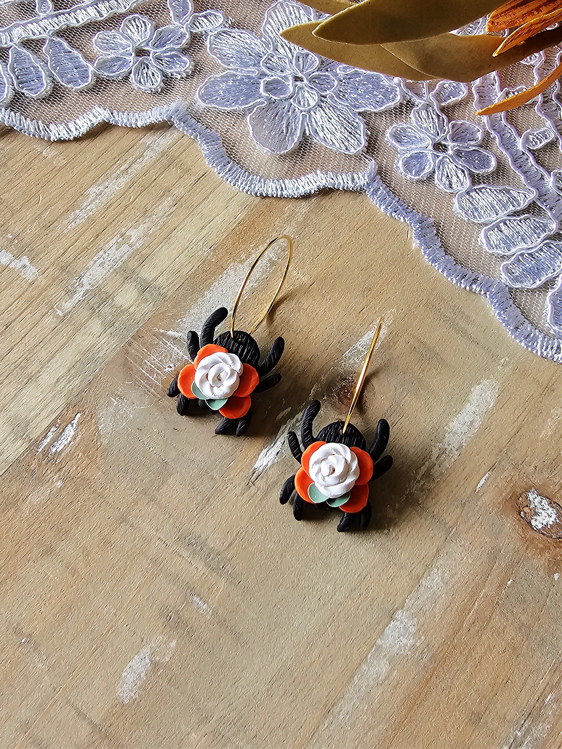 Each pair of our spider floral earrings are based on nature in the autumn seasons. Each pair is hand-sculpted from premium clay and designed to pair with any outfit.