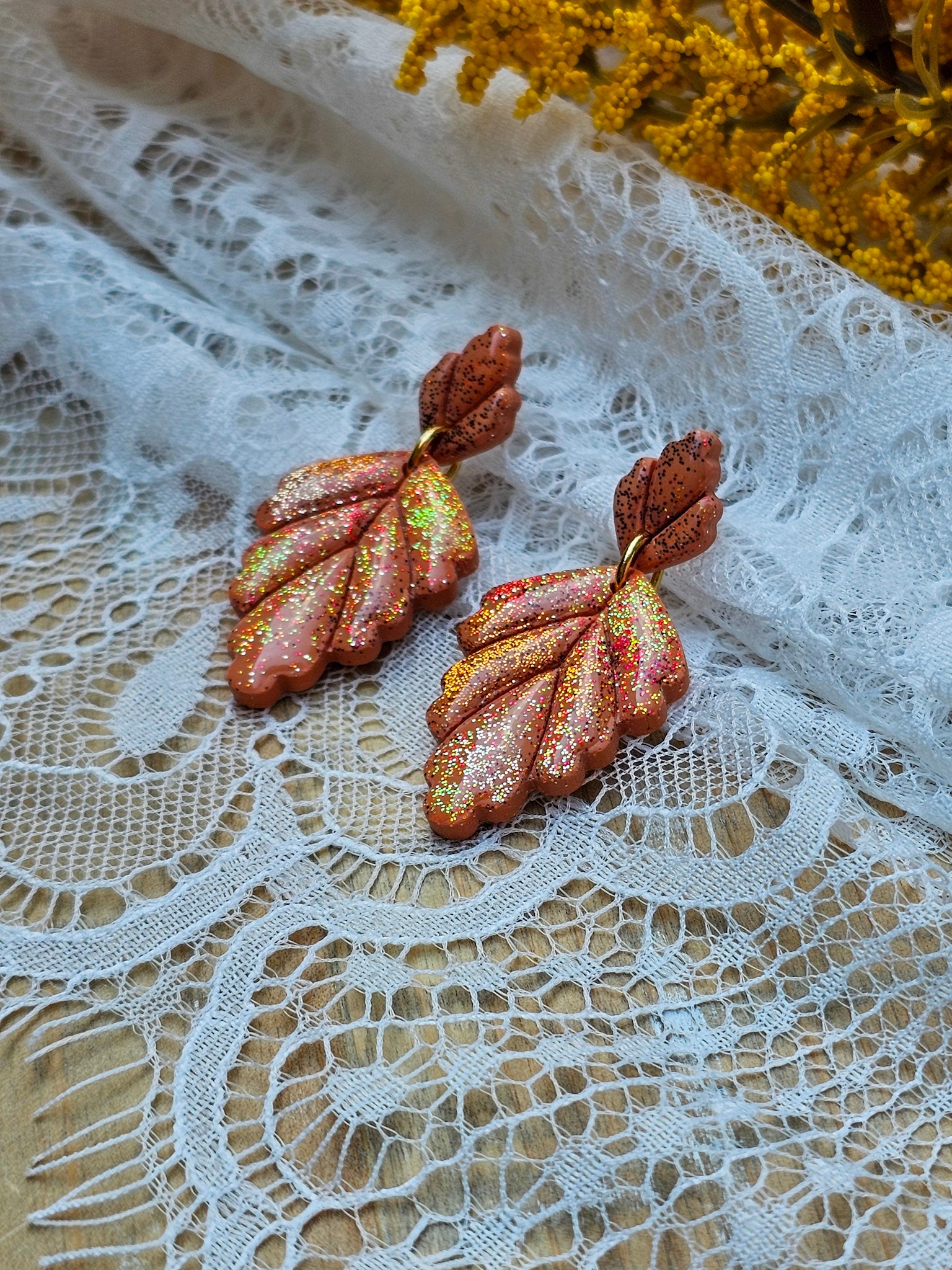 Each pair of our glitter fall leaf earrings are based on nature in the autumn seasons. Each pair is hand-sculpted from premium clay and designed to pair with any outfit.