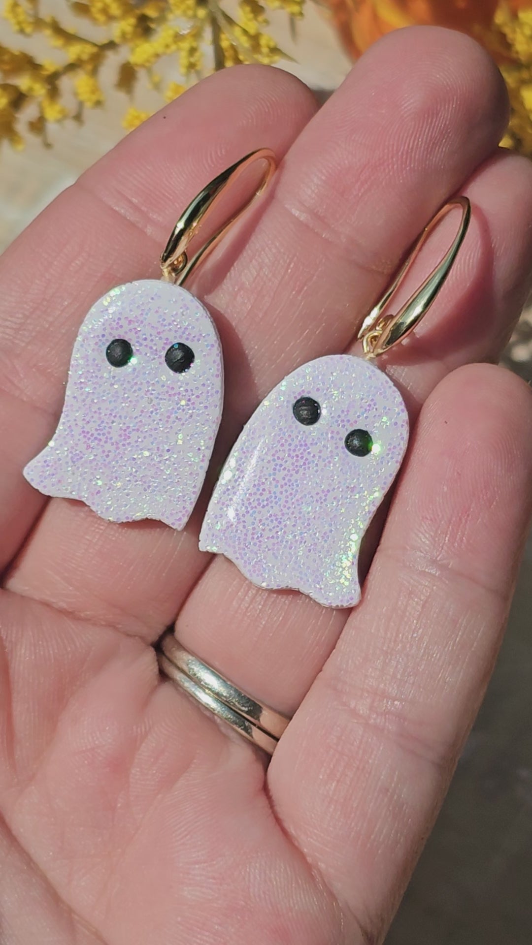 Each pair of our glitter ghost earrings are based on nature in the autumn seasons. Each pair is hand-sculpted from premium clay and designed to pair with any outfit.